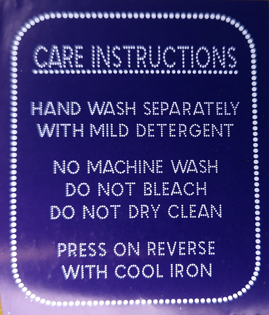Special care instructions: Only cold wash by hand. Hand wash seperately with mild detergent. No machine wash. Do not bleach. Do not dry clean. Press on reverse with cool iron. These instructions must be followed to preserve the metallic effect as much as possible.