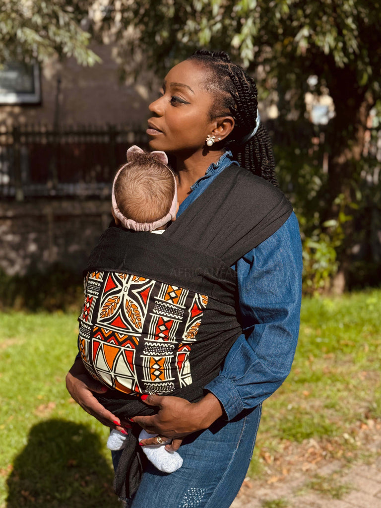 This African print baby wrap sling consists of a high quality soft baby wrap, finished with a beautiful, vibrant, bold and sturdy layer of 100% cotton African wax print fabric on the entire front.