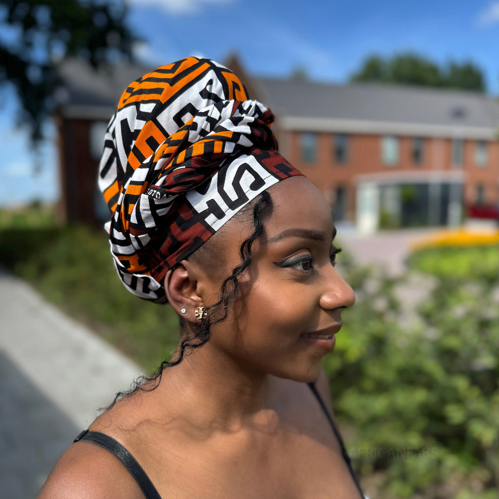 African headwrap - Brown & Yellow-Orange Kuba Blocks Congo