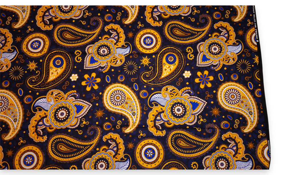 Afrikanischer Print Stoff - Dunkelblau Gelb Paisley - 100% Baumwolle
